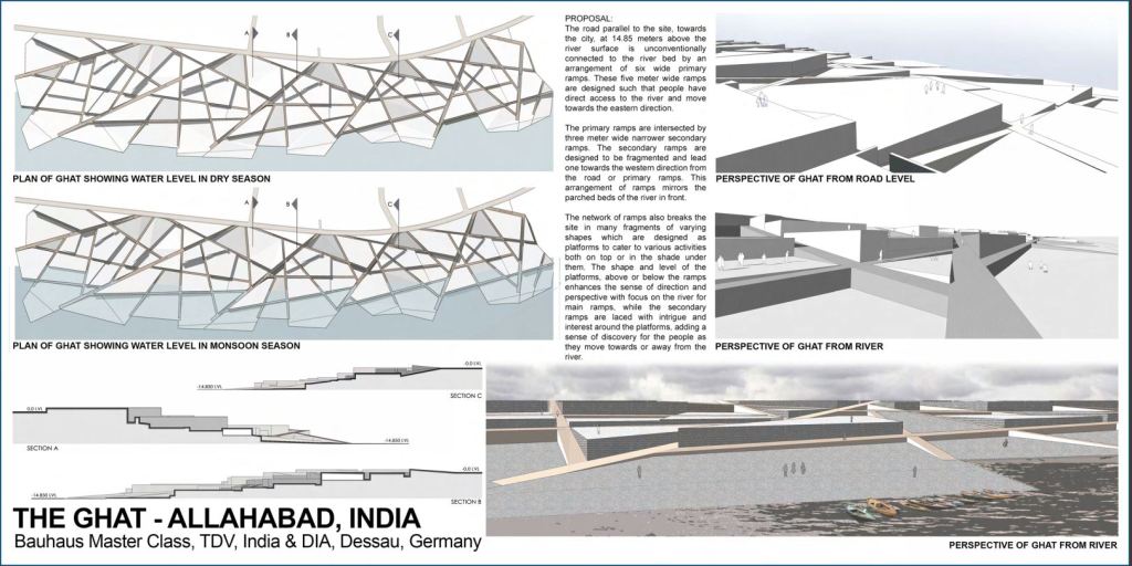The following project of Conceptual Design of the Allahabad Ghat, India was designed as part of the final project of the Cooperative Master Class with TDV, Noida, India and DIA, Dessau, Germany (February 2016). † Ghat Traditionally an ensemble of steps, platforms, landings and niches, a Ghat is essentially an approach to the river bed…