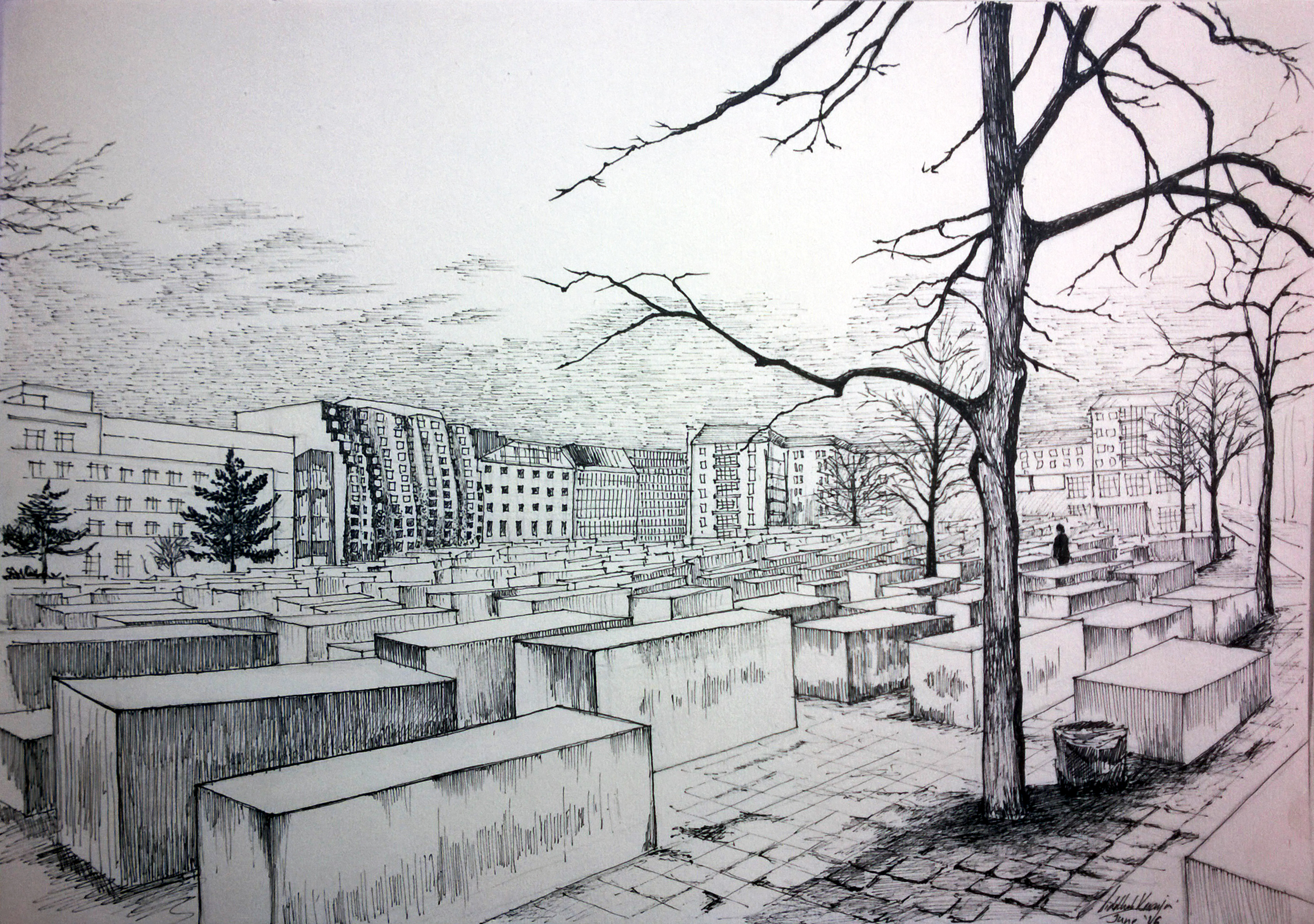 Sketched in Pen & Ink from a Photograph dated Jan 2016, looking over the serene Architecture of the Holocaust