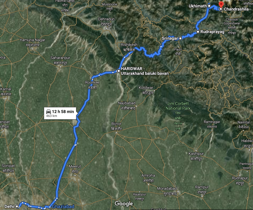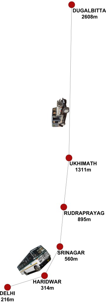 Our first state bus took us from Delhi (216 m) to Haridwar (314 m) covering a distance of 220 km. We reached by daybreak and were lucky to get the connecting bus to our next destination Srinagar (the one in Uttarakhand). We reached Srinagar (560 m) by afternoon after covering a distance of 130 km, snaking its way through the hills, parallel to the Alaknanda river, and rising with the drop of temperature at every hour. From Srinagar, our third bus ride was to Rudraprayag (895 m). We reached Rudraprayag late in the afternoon and after discussing with locals the best way to reach our destination took our fourth state bus to Ukhimath. We reached Ukhimath (1311 m) by evening after covering 44 km. After negotiating with local drivers we boarded a Jeep to complete the last phase of our destination. An hour later, covering 23 km we finally reached Dugalbitta Chopta (2608 m) at the foot of the Himalayas. It was 7 pm, almost 20 hours since we started from Delhi.