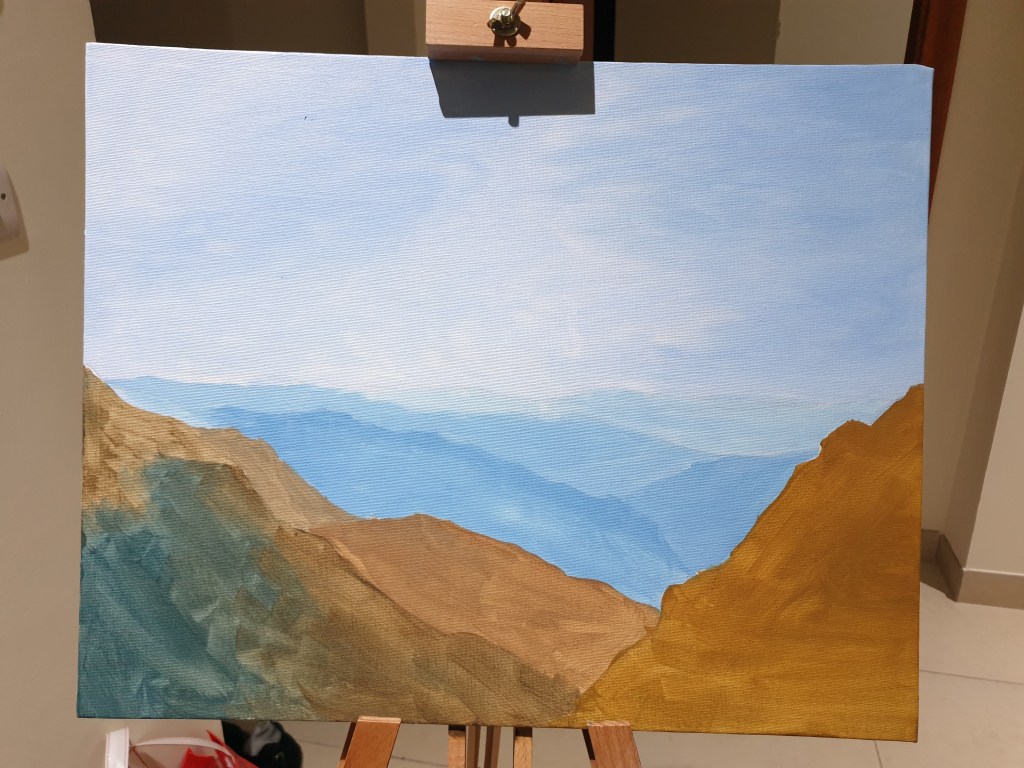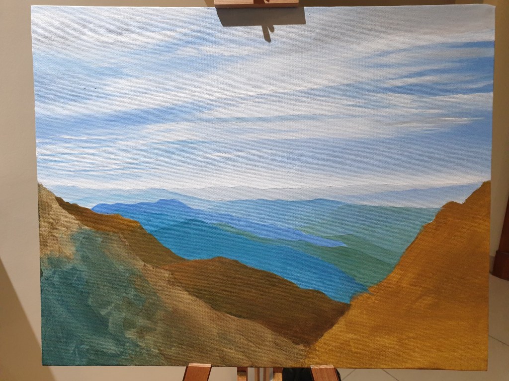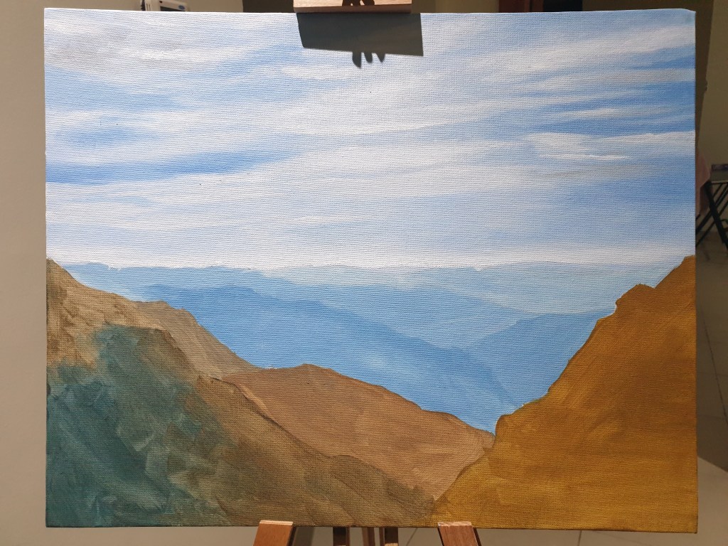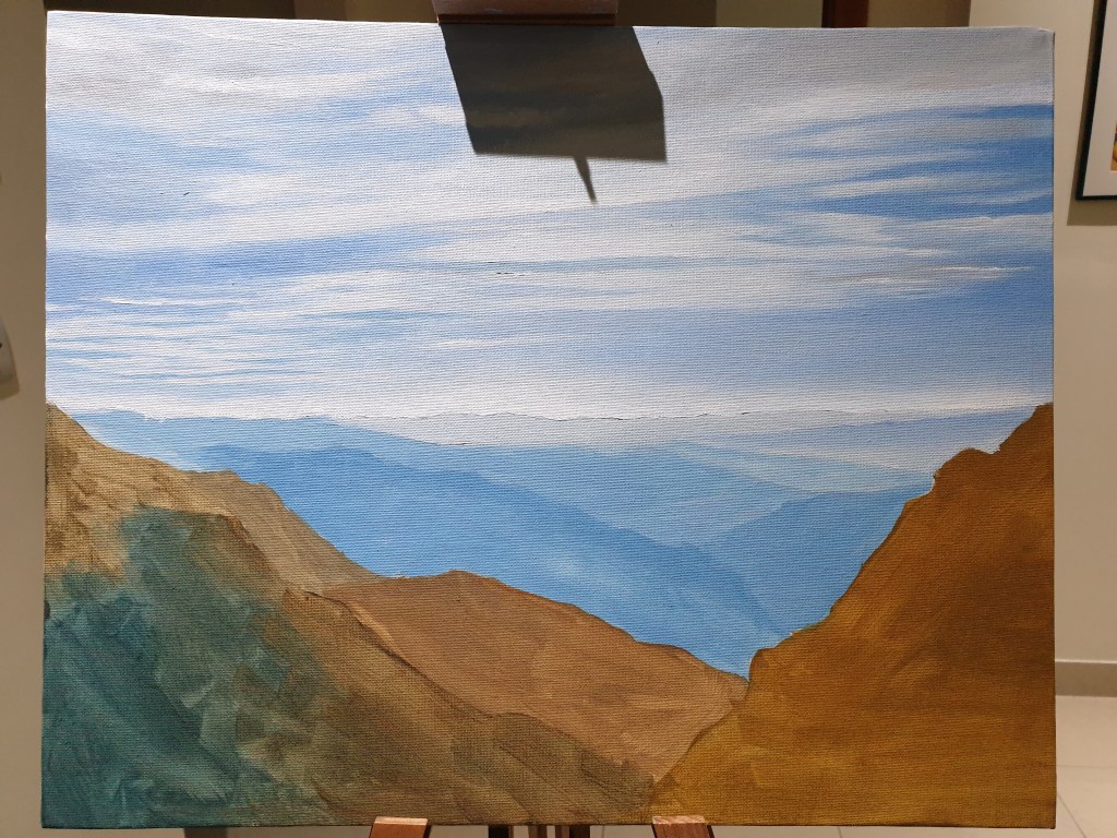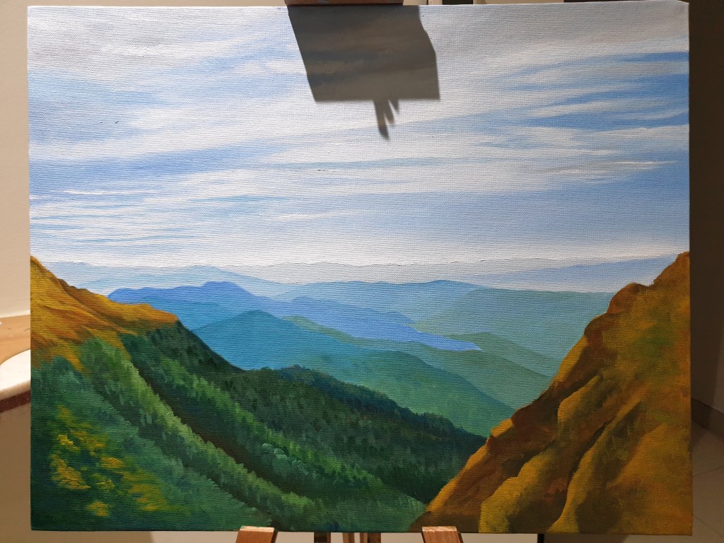 Oil on canvas 40x50cm. An effort to recreate the magic of rolling blue mountains to the edge of the Himalayan horizon. Following images show the progression of the canvas. The final painting: